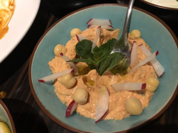 We kiezen niet van de kaart maar laten ons verrassen door Ali’s specialiteiten. De Engels sprekende serveerster loopt een aantal keer heen en weer om onze tafel vol te zetten met allerlei kleurige schaaltjes met lekkers. Niet alleen heel smaakvol, maar het ziet er ook erg fotogeniek uit. We proeven van onder andere baba ghanou, muhamara, hommus met bietjes, tabouleh, soujouk, aardappeltjes en geroosterde bloemkool en motabal. Bijna alle gerechtjes eten we met Libanees platbrood.
