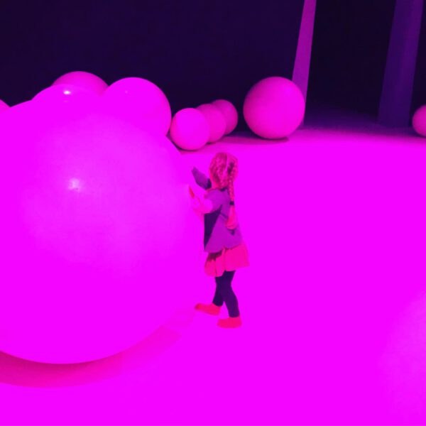 ‘Presence’ is een 800 m2 groot levend lab. De ruimtes bestaan uit verschillende sferen waardoor je allerlei perspectiefwisselingen ondergaat. Van groot en massief naar klein en beweeglijk, van donker naar licht. De ene zaal lijkt gevuld met lichtgevend sterrenstof, dat doet denken aan het uitzicht op een grote stad vanuit een vliegtuig. In de andere zaal tekent mijn peuter met futuristische bollen lijnen op de vloer en speelt in haar eigen fantasiewereld met de lichtgevende piepschuimbolletjes. Het valt mij op dat mijn dochter veel spontaner met de omgeving omgaat dan ik als volwassene. Ze reageert vanuit haar intuïtie en dat is geloof ik precies wat de kunstenaar, Daan Roosegaarde, voor ogen had bij deze tentoonstelling.